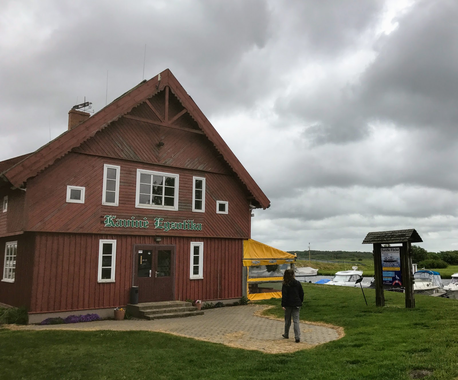By 12:30 or so, we spy the first signs of the approaching delta. The landscape opens up into expansive marshlands, gently sloped banks, wind-scoured grasses. We snake our way through, then come around a broad bend and enter Minge. It's a unique place, a quaint fishing village turned tourist town, where the only "road" is the river--leading the guide books to describe it as "the Venice of Lithuania." This is a considerable overstatement (no one looks at Venice and thinks, "That's the Minge of Italy!") but it's lovely, with picture perfect fairy tale inns and vacation cottages lining both sides of the stream. We tie up the boat and walk along the right bank, passing yachts and guesthouses, then return to the kayak, paddle across the river, and dock again, this time on the left bank, where we find the town's only restaurant/cafe, the Kavine Egzotica. The lunch menu doesn't offer much vegetarian fare, so we turn to the snack section and ask for fried bread with cheese and garlic, thinking we'll get glorified grilled cheese. We don't. Twenty minutes or so after taking our order, the waitress sets down two huge bowls of deep-fried croutons smothered in melted cheese and mayonnaise. It's so ungodly rich and heavy; we can barely make a dent in even one of the bowls, . As Rosa puts it, you know it's not a healthy meal when the french fries on the side are more nutritious than the main course.